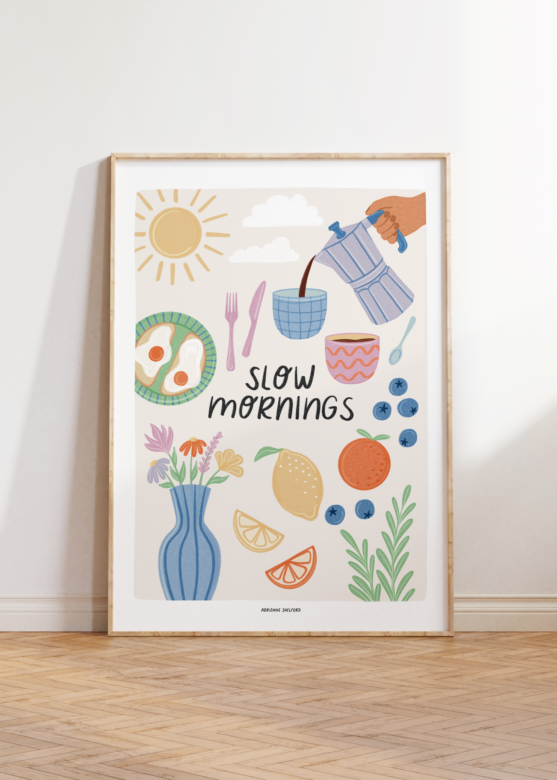 Ease into the day with this cosy art print celebrating the beauty of slow mornings. Featuring warm breakfast elements and gentle colour tones, perfect for adding a touch of calm to your kitchen or dining space.