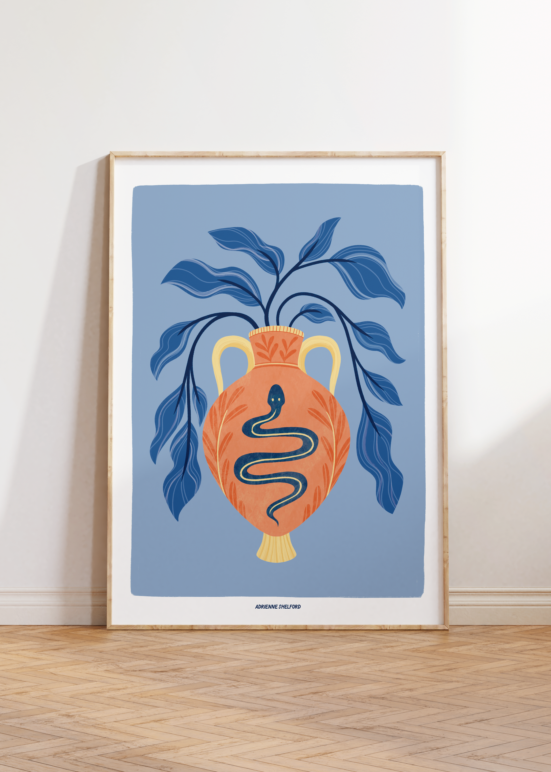 A bold still-life featuring a terracotta vase with a decorative snake motif and flowing blue foliage.